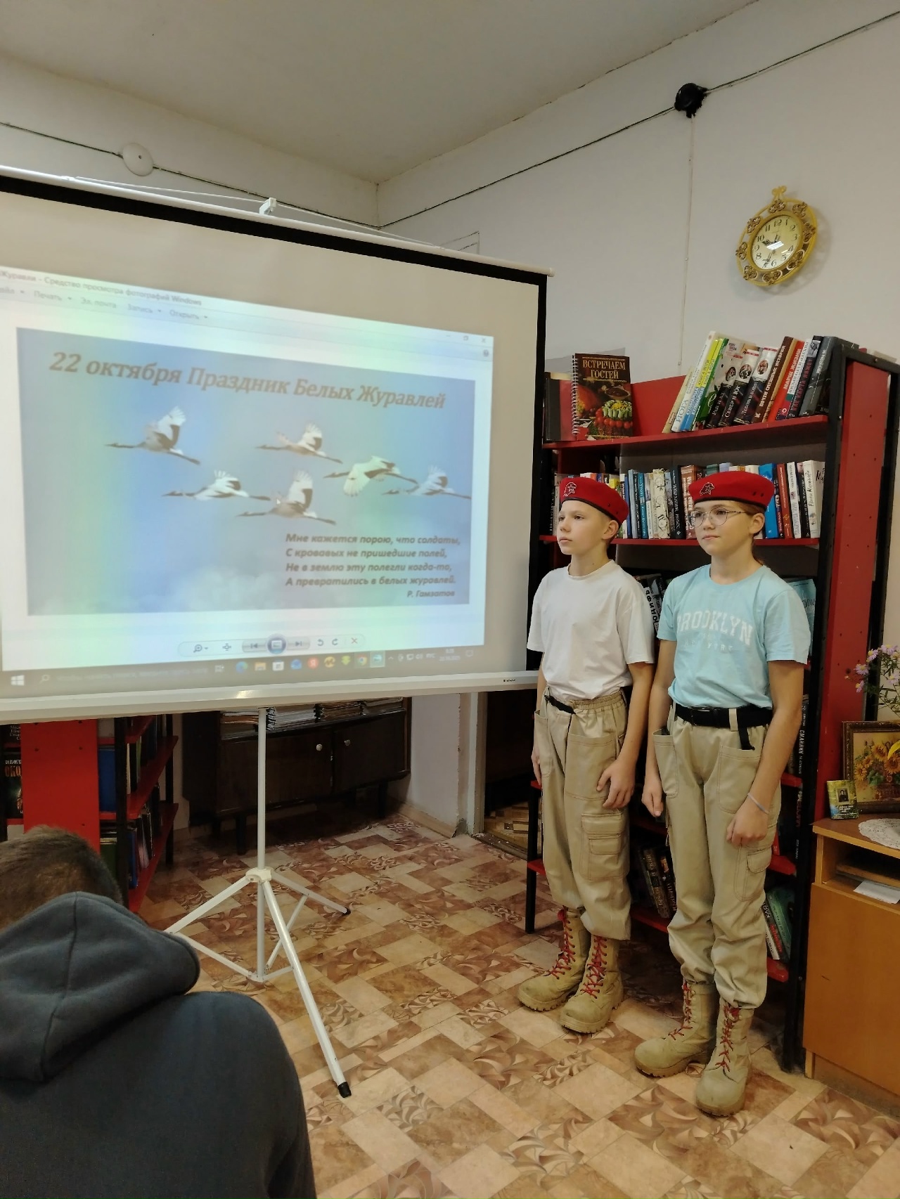 22 октября, в День белых журавлей, в Калашниковской библиотеке для школьников состоялся патриотический час «Нет, не исчезли мы в кромешном дыме…». Ребята почтили память погибших в войнах солдат, познакомились с бессмертным образом белых журавлей из поэзии Расула Гамзатова, узнали об истории праздника и выяснили, почему именно журавль является символом этого дня.