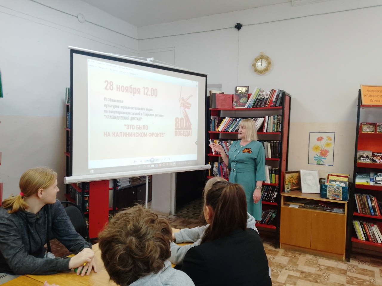 28 ноября Лихославльская библиотека им. Владимира Соколова и Калашниковская библиотека-филиал стали площадками проведения областной культурно-просветительской акции «Краеведческий диктант» по популяризации знаний о Тверском регионе. В этом году диктант был посвящён 80-летию Победы и проходил под названием «Это было на Калининском фронте».