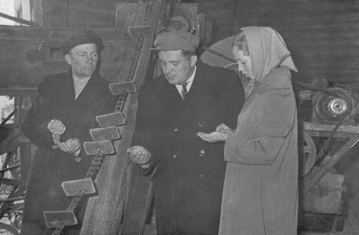 На фотографии 1960-х годов председатель колхоза имени Дзержинского В.А. Бойков с главным агрономом Т.И. Морозовой и рабочим зерносушилки В.А. Поляковым оценивают качество зерна: снижение влажности до определённых значений важно для закладывания урожая на длительное хранение.