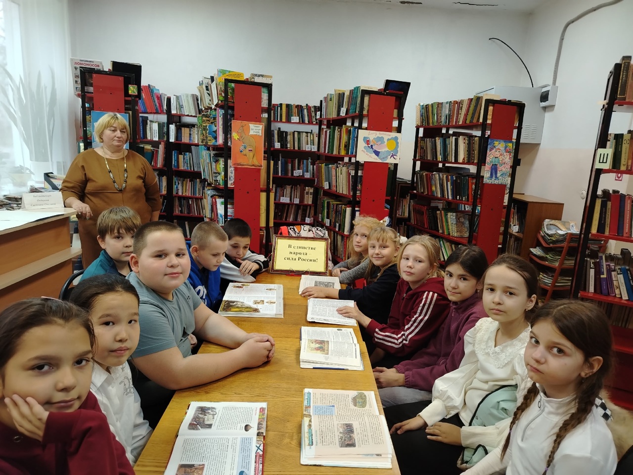 6 ноября, в честь Дня народного единства, в Калашниковской библиотеке состоялся историко-патриотический час для младших школьников «Мы сильны, пока мы вместе». Дети узнали о том, какая большая страна Россия и как многочисленны живущие в ней народы. Библиотекарь рассказала об официальных государственных символах РФ, школьники оформили плакат с их изображением.